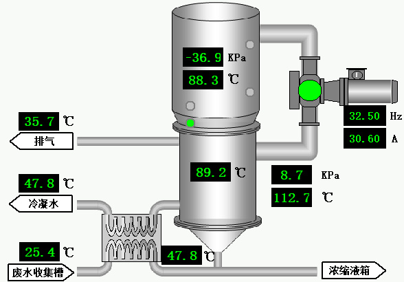 ③蒸發罐內為-35至55KPA(可設定)負壓條件運行,污水升溫至80-90℃開始沸騰,產生大量水蒸汽。